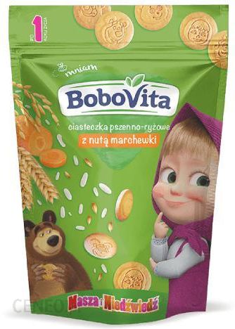 Ciasteczka pszenno-ryżowe z nutą marchewki BOBOVITA, 150gRozmiar i kształt zostały dostosowane do umiejętności najmniejszych rączek, a struktura ciasteczek wspiera naukę gryzienia. Pyszny smak i bohaterowie bajki „Masza i Niedźwiedź” wywołają uśmiech na twarzy malucha.Właściwości:Pyszne ciasteczka z bohaterami bajki „Masza i Niedźwiedź”Doskonałe do nauki samodzielnego jedzenia i gryzieniadopasowane do małej rączkiSkład:mąka pszenna 73 %, cukier trzcinowy, olej słonecznikowy, inulina, mąka ryżowa 1,7 %, marchewka w proszku/proszek marchewkowy 1,2 %, substancje spulchniające (węglany amonu, węglany sodu), emulgator (lecytyny ze słonecznika), regulator kwasowości (kwas cytrynowy), naturalny aromat waniliowy, ekstrakt z oliwek, tiamina.Może zawierać: soję, jaja, mleko oraz orzechy (orzechy laskowe).