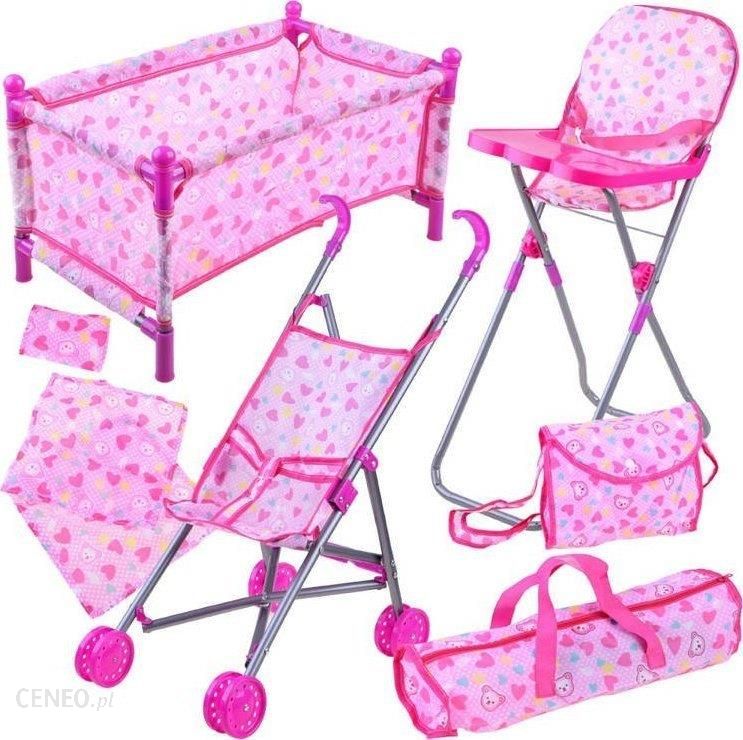 Wieloelementowy zestaw dla lalek to propozycja dla każdej małej opiekunki. Zestaw składa się z łóżeczka turystycznego, wózka spacerówki i krzesełka do karmienia. Dodatkowo w zestawie znajduje się torebka oraz pokrowiec na łóżeczko.Zestaw wykonany jest bardzo estetycznie i efektownie, konstrukcja wózka oraz łóżeczka wykonana została z plastikowych rurek, zaś konstrukcja krzesełka z metalowych rurek oraz plastikowych elementów. Zestaw został obszyty różowym materiałem z grafiką buziek Misi oraz serduszek.Dzieci uwielbiają naśladować, obserwować dorosłych także ten wieloelementowy zestaw sprosta oczekiwaniom najmniejszych opiekunów lalek i misi.Zestaw jest składany, dzięki temu po skończonej zabawie będzie można go wygodnie schować.Zestaw zawiera:- łóżeczko z podusią i kołderką + pokrowiec na łóżeczko- wózek z torebką- krzesełko do karmieniaZestaw nie zawiera lalki.Wymiary:- łóżeczko 59 x 47 x 27 cm- kołderka 19 x 20 cm- wózek 53 x 37 x 23 cm- torebka 24 x 16 x 12,5 cm- krzesełko 61 x 26 x 23 cmKażda mała dziewczynka uwielbia spacerować i opiekować się swoimi maskotkami, lalami. Dzięki zestawowi będzie mogła zabrać je ze sobą na spacer w wózeczku, spokojnie nakarmić oraz ułożyć do snu w uroczym łóżeczku.Zestaw został zapakowany w kolorowe, tekturowe opakowanie, które świetnie sprawdzi się na prezent.Sklep Jokomisiada oferuje szeroki wybór zabawek dla najmłodszych sprawdź koniecznie.