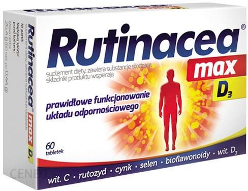 Składniki Rutinacea Max D3 wspierają prawidłowe funkcjonowanie układu odpornościowego.Suplement diety Rutinacea max D3 zawiera: rutozyd, witaminy C i D, cynk, selen oraz wyciąg z owoców pomarańczy gorzkiej, w tym bioflawonoidy.Selen, cynk oraz witaminy D i C pomagają w prawidłowym funkcjonowaniu układu odpornościowego. Ponadto witamina C przyczynia się do zmniejszenia uczucia zmęczenia i znużenia. Selen i cynk pomagają w ochronie komórek przed stresem oksydacyjnym. Obecna w składzie witamina D pomaga w utrzymaniu zdrowych kości i zębów oraz w prawidłowym funkcjonowaniu mięśni.