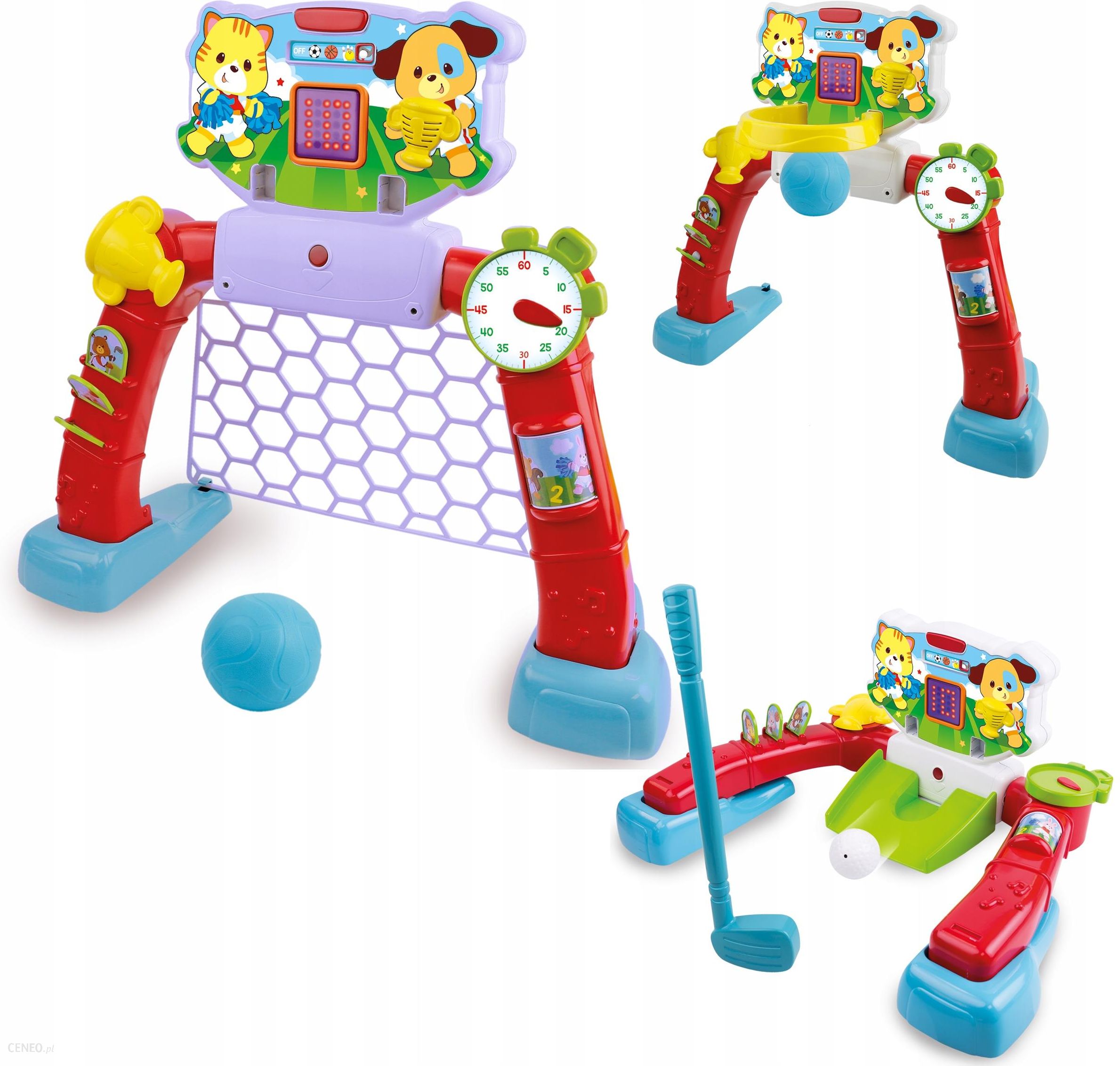 Jeśli Twoje dziecko to żywe srebro podaruj mu wyjątkowe Centrum sportu 4w1 SMILY PLAY, a pomożesz mu spożytkować nadmiar energii. W fantastycznym zestawie na małego sportowca czekają cztery znane i lubiane na całym świecie gry sportowe. Malec odkryje uroki rozgrywek golfa, potrenuje celne strzały do bramki albo rzuty do kosza oraz spróbuje swoich sił w partii kręgli.Efekty dźwiękowe uatrakcyjnią i nadadzą zabawie realizmu. Mały zawodnik usłyszy dźwięk gwizdka, w rozgrywkach towarzyszyć mu będą radosne melodyjki, animacje i aplauz publiczności. Osiągnięcia w postaci punktów i zaliczonych bramek wyświetlą się na tablicy wyników z ekranikiem LCD. Żywe kolory zabawki i efekty dźwiękowe zachęcają do zabawy, a znajdujące się na ramie bramki ruchome elementy zapewnią małym, zwinnym paluszkom zawodnika zajęcie podczas przerw w rozgrywkach. Malec może bawić się samodzielnie w trybie dowolnym, albo zaprosić rodzeństwo i przyjaciół do wspólnych zawodów, i wybrać grę na punkty.Fantastyczne Centrum sportowe 4w1SMILY PLAY zachwyci małego sportowca, a zabawa dostarczy mu mnóstwo frajdy. Rozgrywki to doskonały pomysł na aktywne spędzanie wolnego czasu. Podczas nich maluch trenuje rozwój koordynację ręka-oko, uczy się cierpliwości i współpracy w grupie. Całość wykonana jest z materiałów najwyższej jakości, by zapewnić dziecku bezpieczeństwo . Aby wszystkie elementy zestawu służyły jak najdłużej należy pamiętać o prawidłowym użytkowaniu. Zabawki nie wolno zanurzać w wodzie, wskazane jest regularne sprawdzanie mocowania łączników. Dołączoną do zestawu piłkę można w razie potrzeby napompować ręczną pompką ze standardową igłą.Zestaw zawiera:Centrum sportu 4w1wielofunkcyjną piłkękręglekij i piłeczkę do golfaefekty dźwiękowe i świetlneposiada ruchome elementy: obracane obrazki, walec, puchar i wskazówki zegara3 testowe baterie AAprodukt nowy, oryginalnie zapakowanyprzeznaczony dla dzieci od 18 miesiąca życiaGry dostępne w zabawce:piłka nożnakoszykówkagolfkręgle